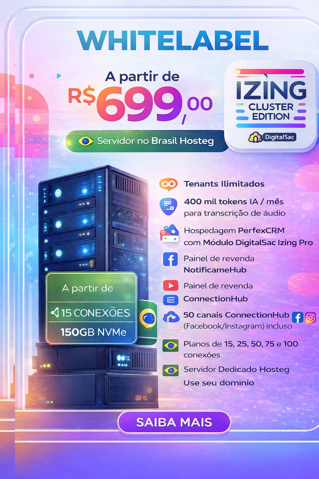 Com o Izing Pro Cluster Edition, você tem WhatsApp Oficial nativo, canais Telegram, Whatsmeow, Baileys, Webchat, Email, Facebook, Instagram e integração total com CRM, IA, campanhas e muito mais – sem taxas ocultas!